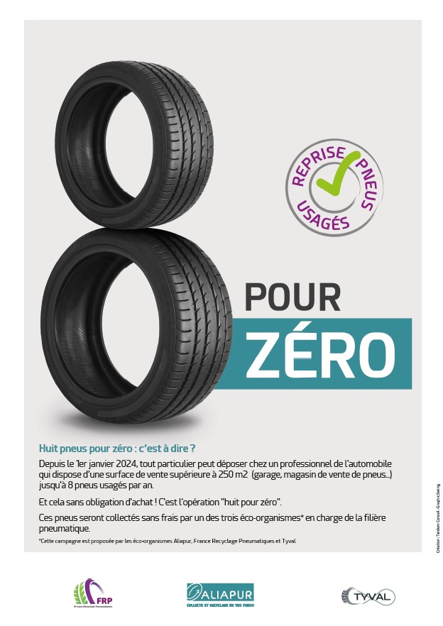 Depuis le 1er janvier 2024, chaque foyer peut déposer chez l’un des 40 000 professionnels de l’automobile jusqu’à huit pneus usagés par an sans obligation d’achat. Les distributeurs de pneus dont la surface de vente fait au moins 250 m² ont l’obligation de les reprendre gratuitement, ceux dont la surface de vente est plus petite peuvent aussi les reprendre mais ne sont pas obligés de le faire sans obligation d’achat.